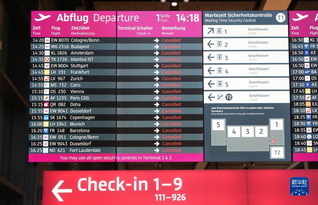 1月25日,在德國柏林-勃蘭登堡機場航站樓內,屏幕上顯示航班取消信息。