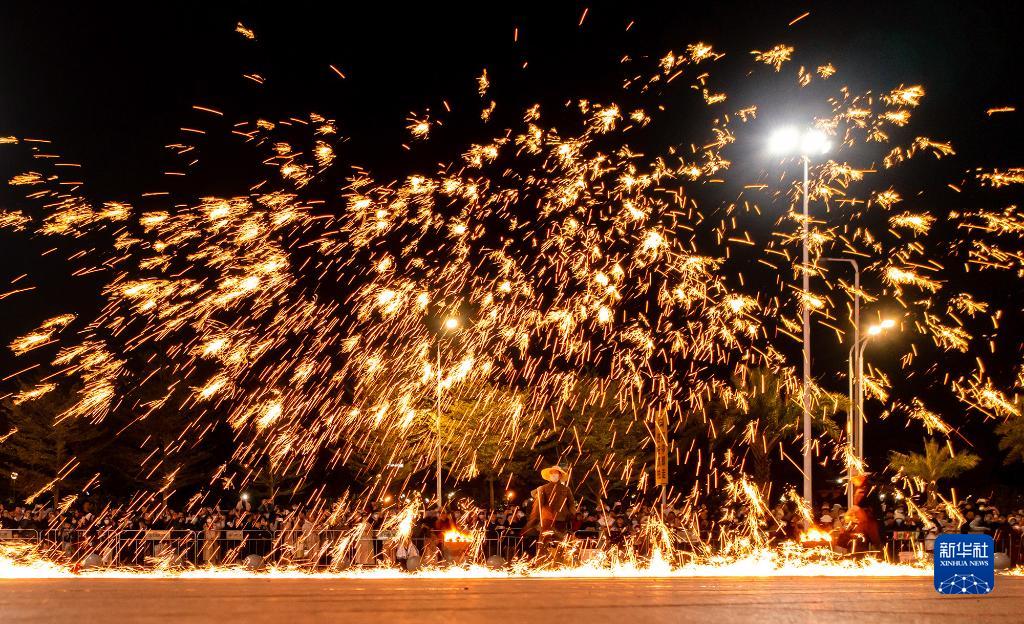 當晚,廣東省揭陽市上演了一場精彩的“打鐵花”非遺表演活動,吸引了大量市民和游客前來觀賞,營造出濃郁的節日氛圍。