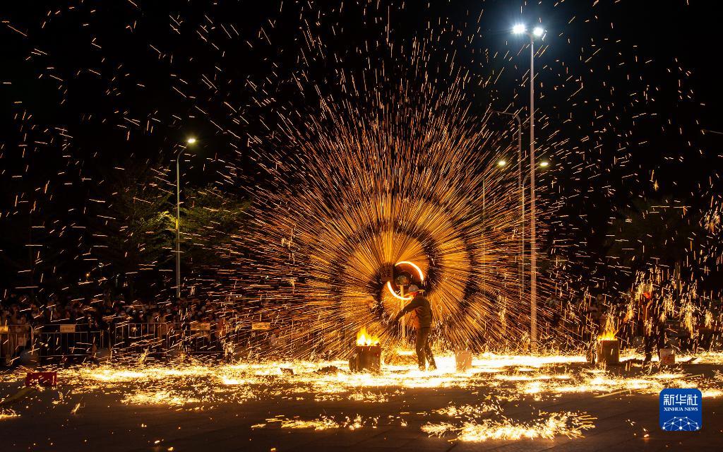當晚,廣東省揭陽市上演了一場精彩的“打鐵花”非遺表演活動,吸引了大量市民和游客前來觀賞,營造出濃郁的節日氛圍。