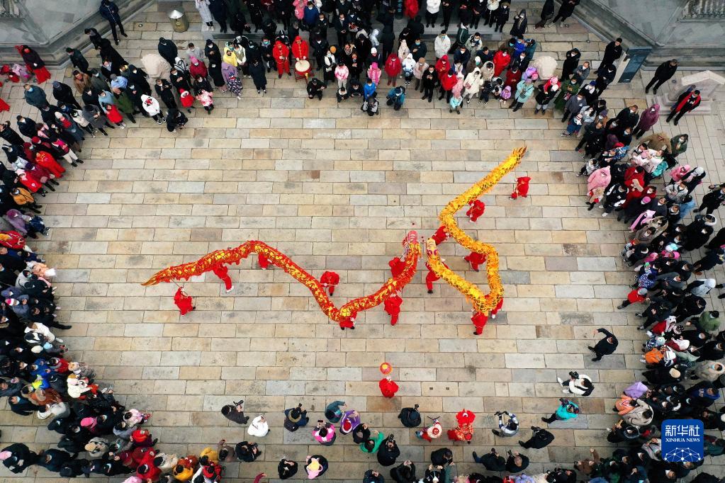 1月26日,民間藝人在山東省青島市即墨古城表演舞龍(無人機照片)。