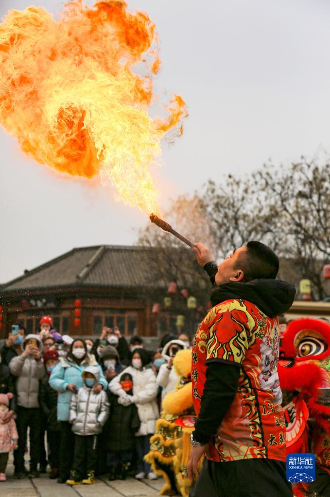 1月26日,民間藝人在山東省青島市即墨古城表演“噴火”。