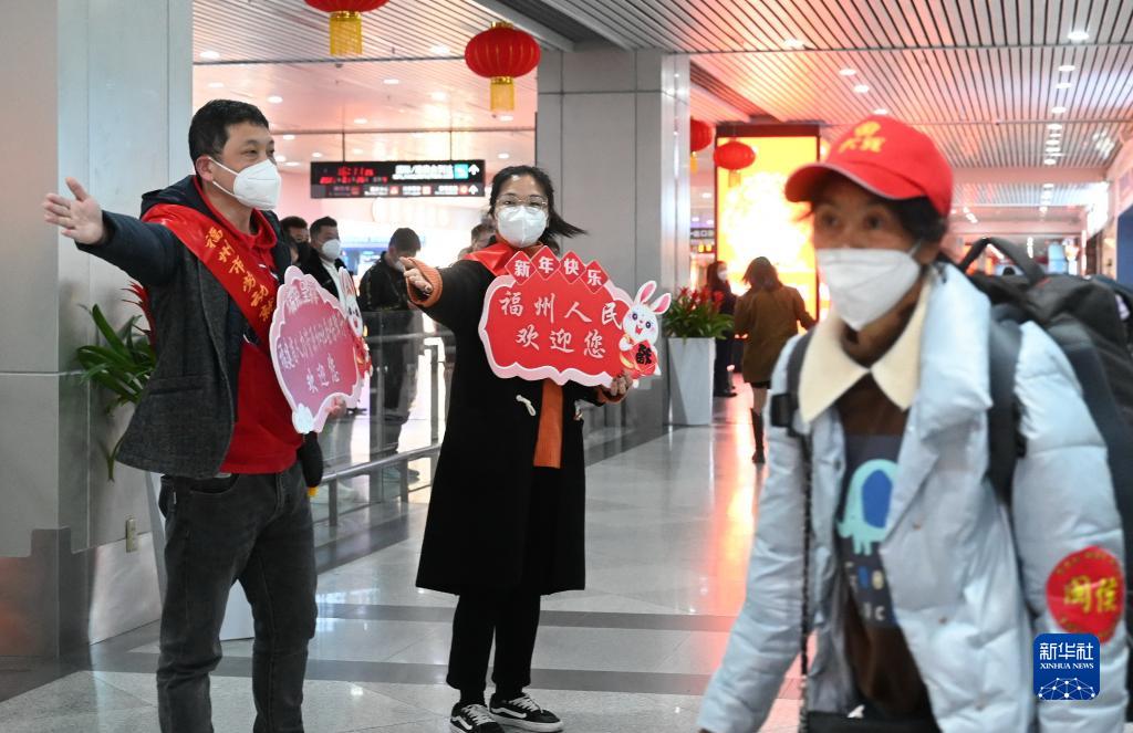 1月26日,工作人員在福州長樂國際機場引導返崗務工人員。