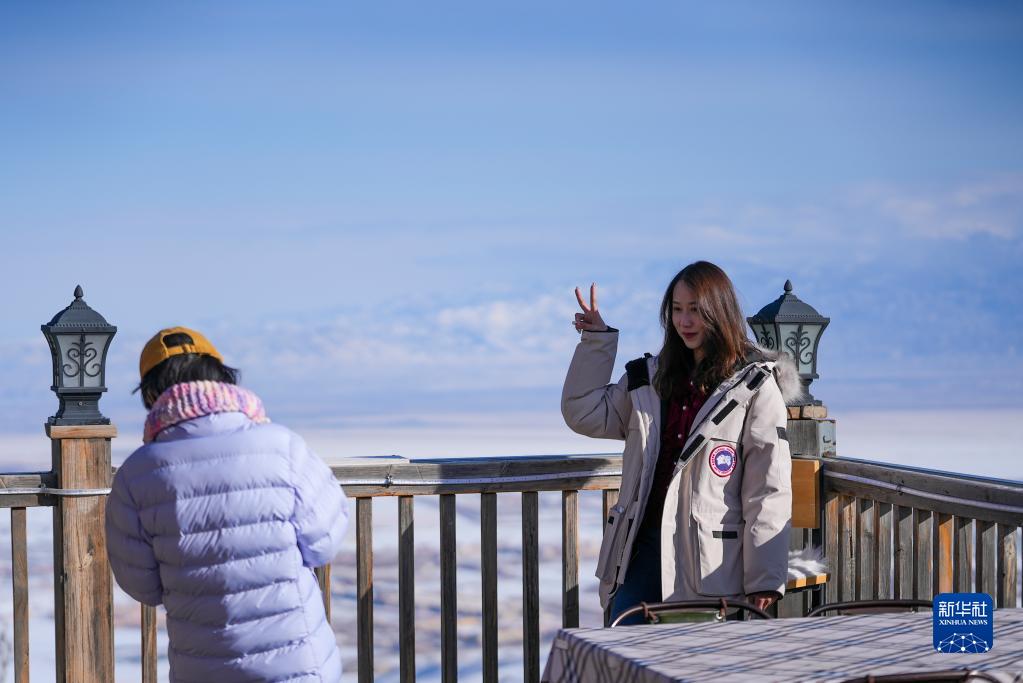 游客在絲綢之路國際滑雪場艾文大道頂上的咖啡屋拍照留念(1月25日攝)。
