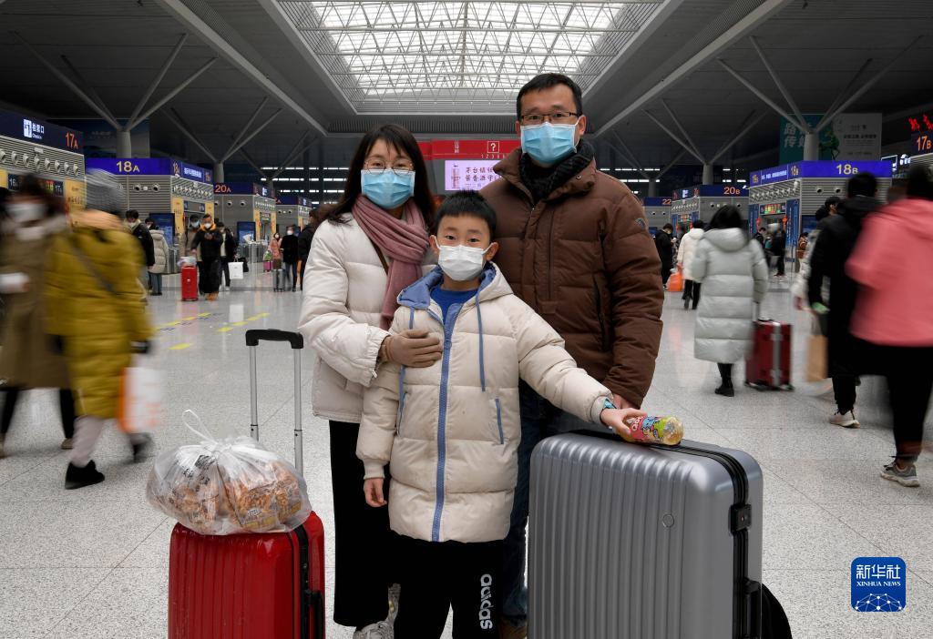 河南省信陽市浉河區董家河鄉高嶺村人劉紅善(右)和愛人傅雪梅、兒子劉宇辰在鄭州東站候車大廳內候車,準備去往廣州(1月26日攝)。劉紅善在廣州已經工作了6年,近3年都沒能回老家過春節,今年專門回家陪老父親過節。