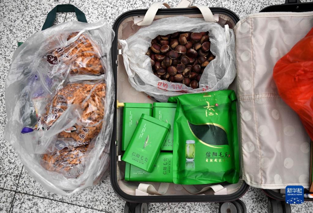劉紅善行囊里裝的家人給準備的信陽特產茶葉和板栗等(1月26日攝)。