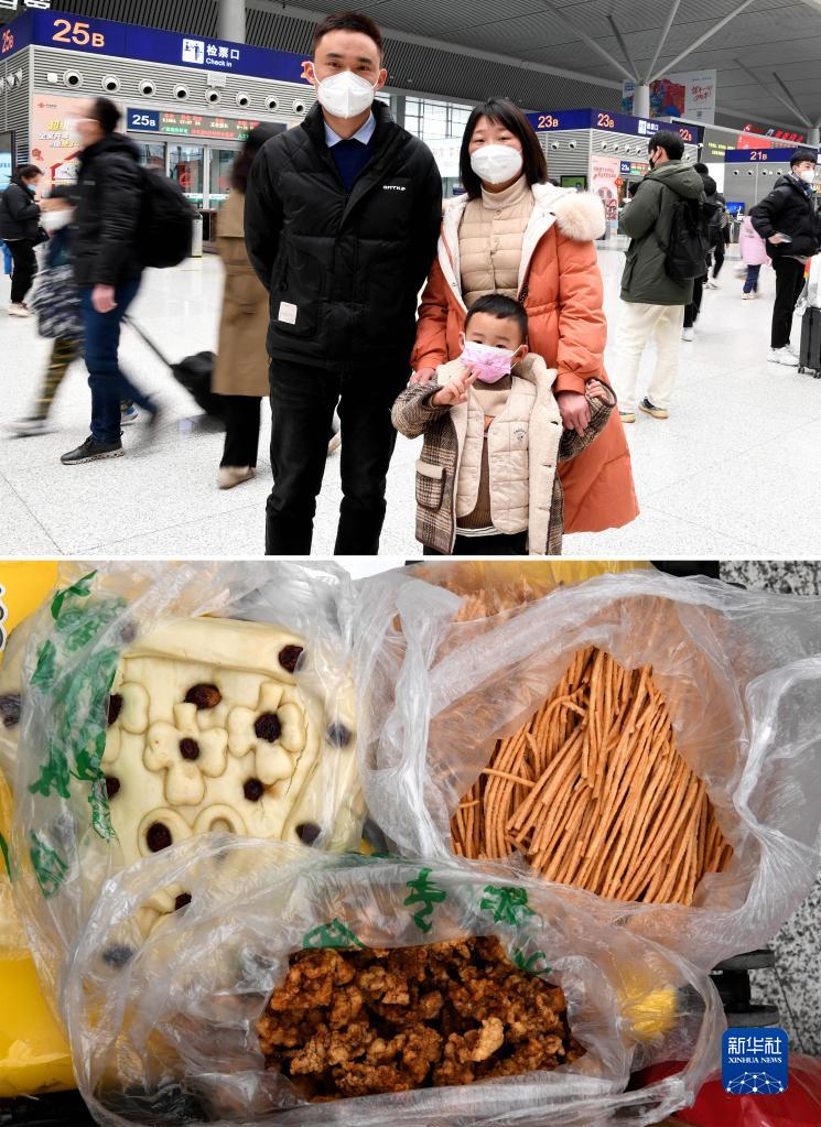 拼版照片:上圖為河南省周口市沈丘縣人崔偉(左)和愛人劉虹、兒子崔堇揚在鄭州東站候車大廳內候車,準備去往成都(1月26日攝)。由于各種原因,崔偉已經十幾年沒能回老家過春節了,以前坐綠皮車回家要二十幾個小時,現在乘高鐵只要七八個小時就能到達。下圖為崔偉行囊里裝的母親親手制作的油炸酥肉、棗饃等他和兒子愛吃的食品(1月26日攝)。