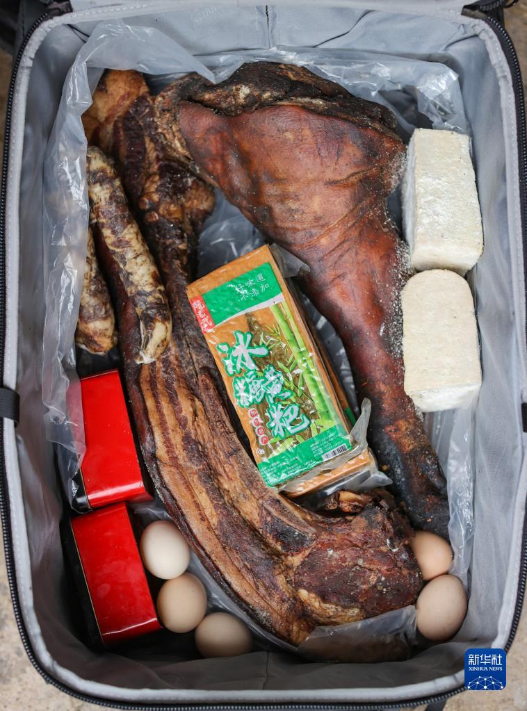 彭沙行囊里裝的物品(1月26日攝)。彭沙行囊里裝著父母親手制作的臘肉、臘豬腳、香腸、茶葉、石灰豆腐、咸蛋及當地特色小吃冰糖黃粑等。