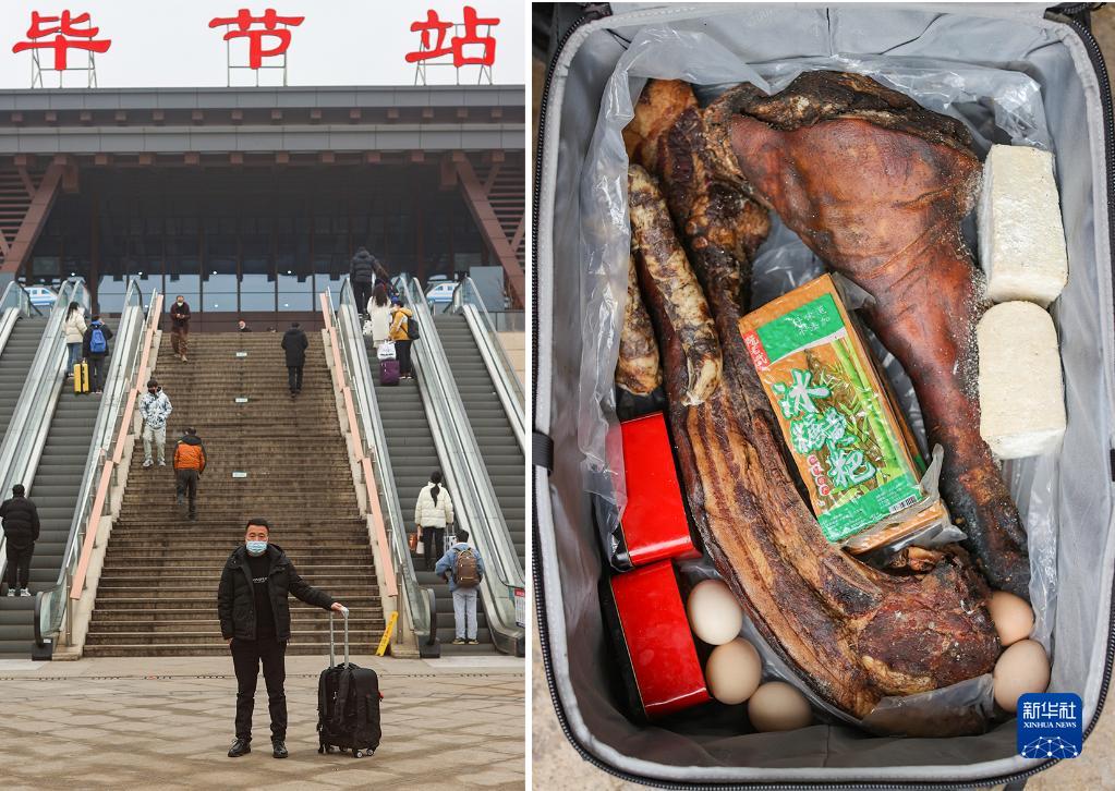 拼版照片:左圖為貴州省畢節市七星關區海子街鎮安山村人彭沙提著行李在畢節站站前廣場留影,他準備前往廣東省深圳市(1月26日攝)。彭沙之前在深圳打工6年,此次是去學習汽車檢測管理技術。以前從畢節乘汽車到貴陽轉乘綠皮火車再到深圳要兩天一夜,現在乘高鐵只要幾個小時就能到達。右圖為彭沙行囊里裝的物品(1月26日攝)。彭沙行囊里裝著父母親手制作的臘肉、臘豬腳、香腸、茶葉、石灰豆腐、咸蛋及當地特色小吃冰糖黃粑等。