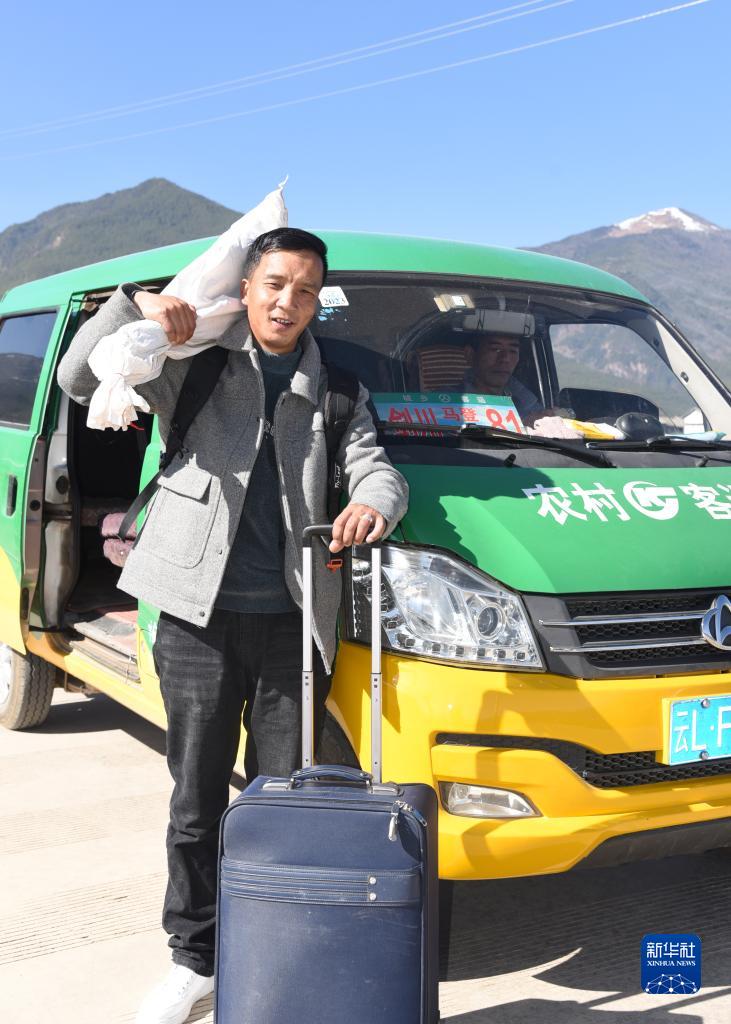 云南省大理白族自治州劍川縣馬登鎮文屏村人張茂盛扛著火腿、扶著行李箱在農村客運車前留影,準備前往云南省麗江市創業(1月26日攝)。這是張茂盛外出務工的第10年,他一直在云南迪慶、麗江兩地從事建筑行業,期間還創業開過燒烤店和小食店。