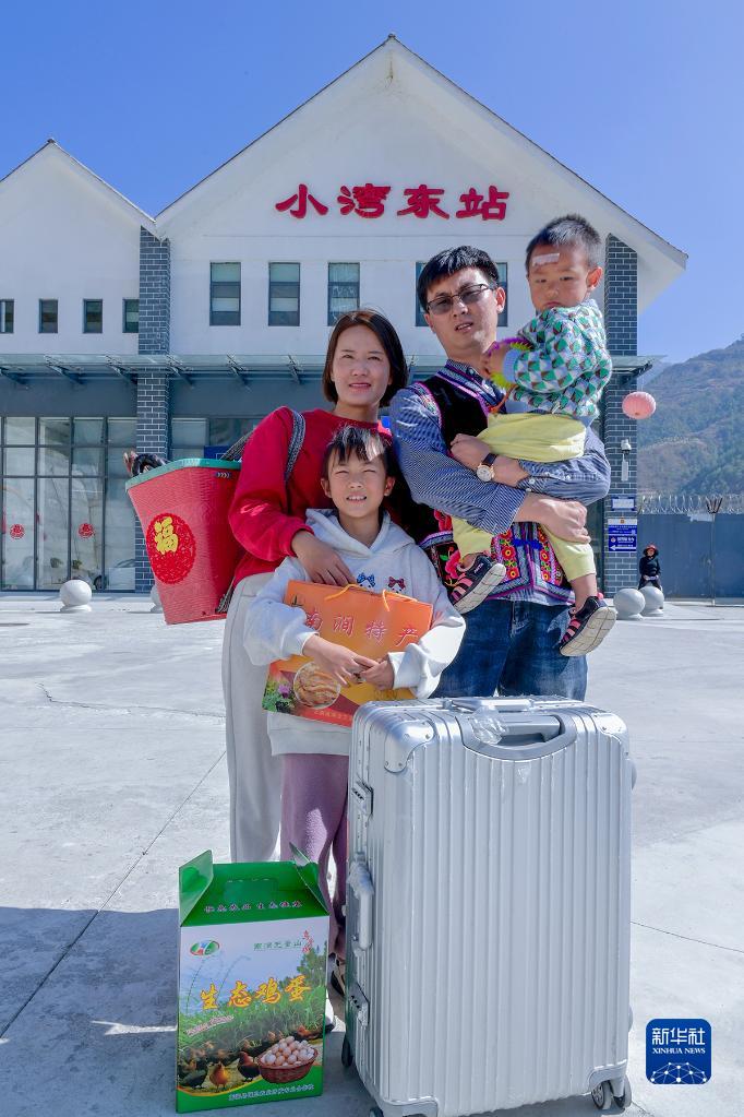 云南省大理白族自治州南澗彝族自治縣小灣東鎮紙房村人蘭云婭(后左一)一家提著行李在小灣東站候車,準備返回昆明(1月26日攝)。從前,從小灣東鎮到昆明需要一天一夜,現在乘高鐵只要3個小時就能到達。