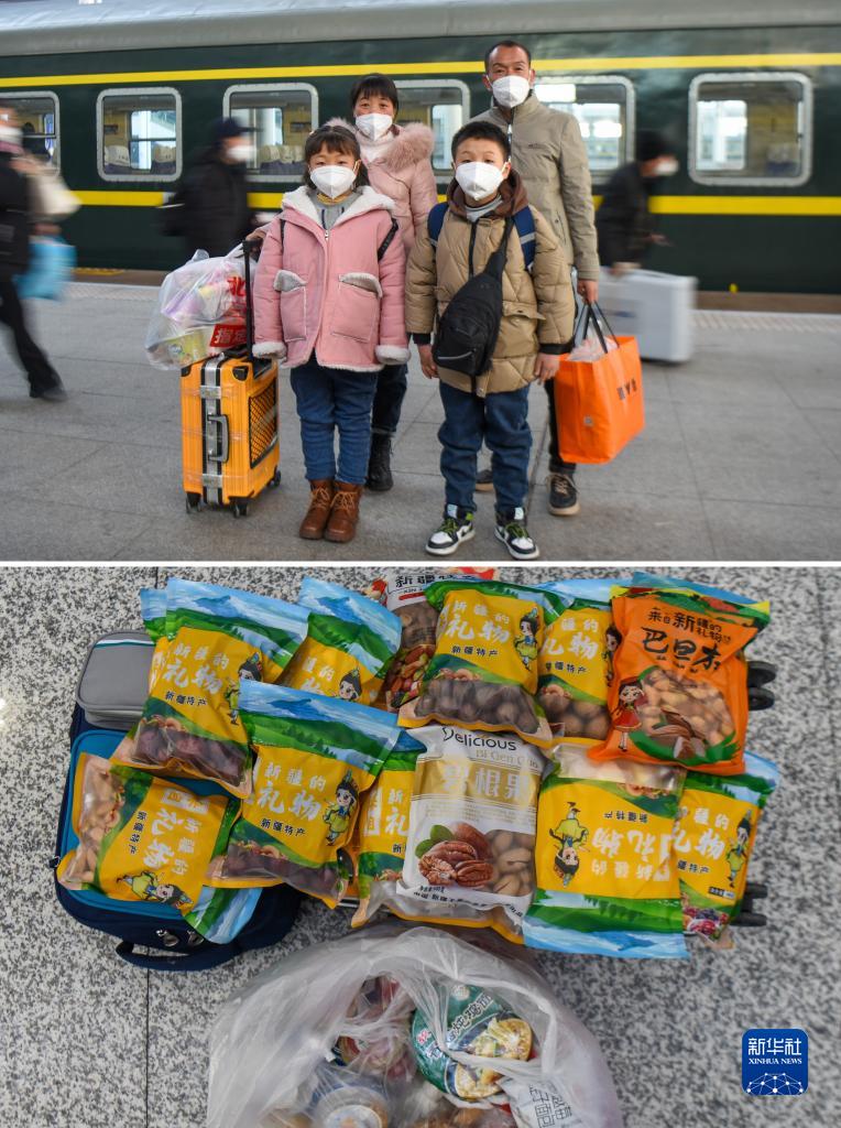 拼版照片:上圖為嫁到甘肅省岷縣的新疆呼圖壁縣人汪元芳(后左一)一家在新疆烏魯木齊站準備乘坐火車前往甘肅。時隔兩年,汪元芳帶著全家人回到新疆呼圖壁縣,在娘家度過2023年的春節(1月26日攝)。下圖為汪元芳一家行囊里裝的物品。除了在火車上的吃食外,汪元芳的父母還給他們裝了葡萄干、核桃、大棗等新疆特色干果(1月26日攝)。