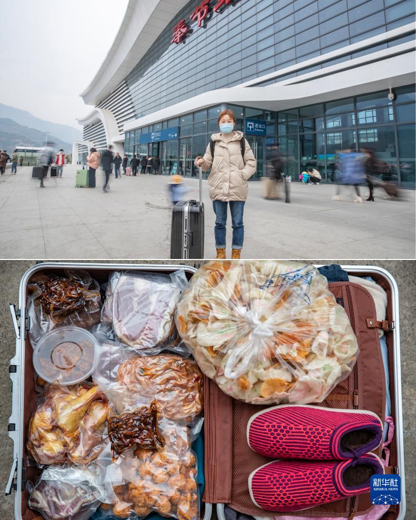 拼版照片:上圖為重慶市巫溪縣花臺鄉花臺村人劉明興在奉節站候車,準備去往重慶主城上班(1月26日攝)。劉明興在重慶主城已工作了8年,因為各種原因已經兩年沒能回老家過春節,今年專門回家陪家人一起過節。下圖為劉明興行囊里裝的物品(1月26日攝)。除了自己帶的衣物外,劉明興行囊里裝滿了家人給準備的土雞、臘肉、自制的牛肉干和母親為她親手鉤織的棉鞋等物品。