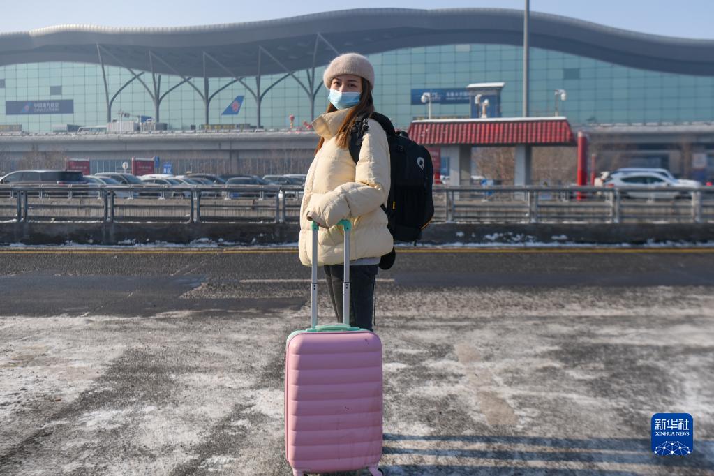新疆女孩戴詩蕊在新疆烏魯木齊地窩堡國際機場T3航站樓前,準備乘飛機前往北京(1月26日攝)。大學畢業后就留在北京工作的她每年過年都會回到烏魯木齊和家人團聚。