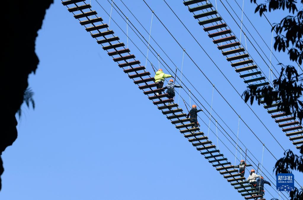 春節假期,人們前往地處鄂西山區的宣恩縣鑼圈巖地質公園,體驗天坑上空行走、深入洞穴探險等,學習地質知識,挑戰自我,樂享戶外休閑的樂趣。