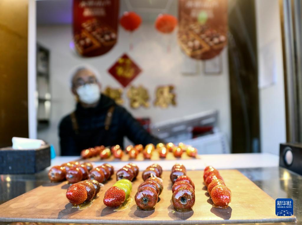 北京南鑼鼓巷一家小吃店出售的冰糖葫蘆(1月27日攝)。