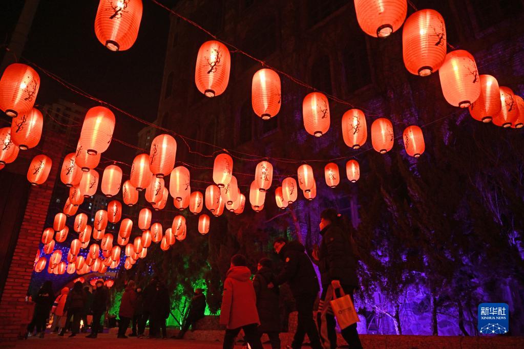 春節期間,天津中華石園景區舉辦的新春民俗燈會吸引了眾多游客。夜幕降臨后,融合兔子、二十四節氣等元素的各式彩燈結合現代光影變得惟妙惟肖、活靈活現。市民及游客在此賞燈游玩、“打卡”拍照,感受節日氛圍。
