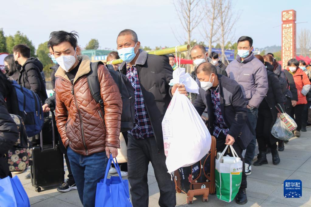 1月27日,務工人員帶著行李排隊進站。