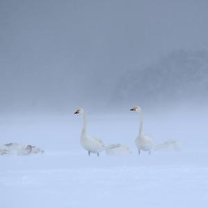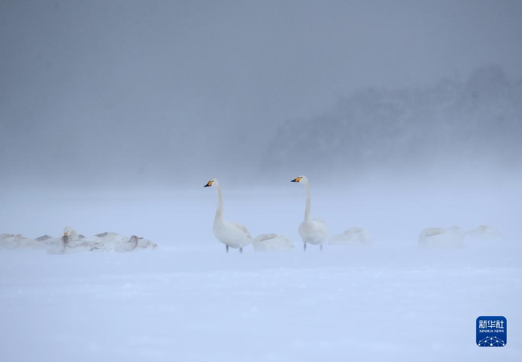 近日,山東榮成出現降雪。在榮成天鵝湖,大天鵝迎風戲雪,翩翩起舞。