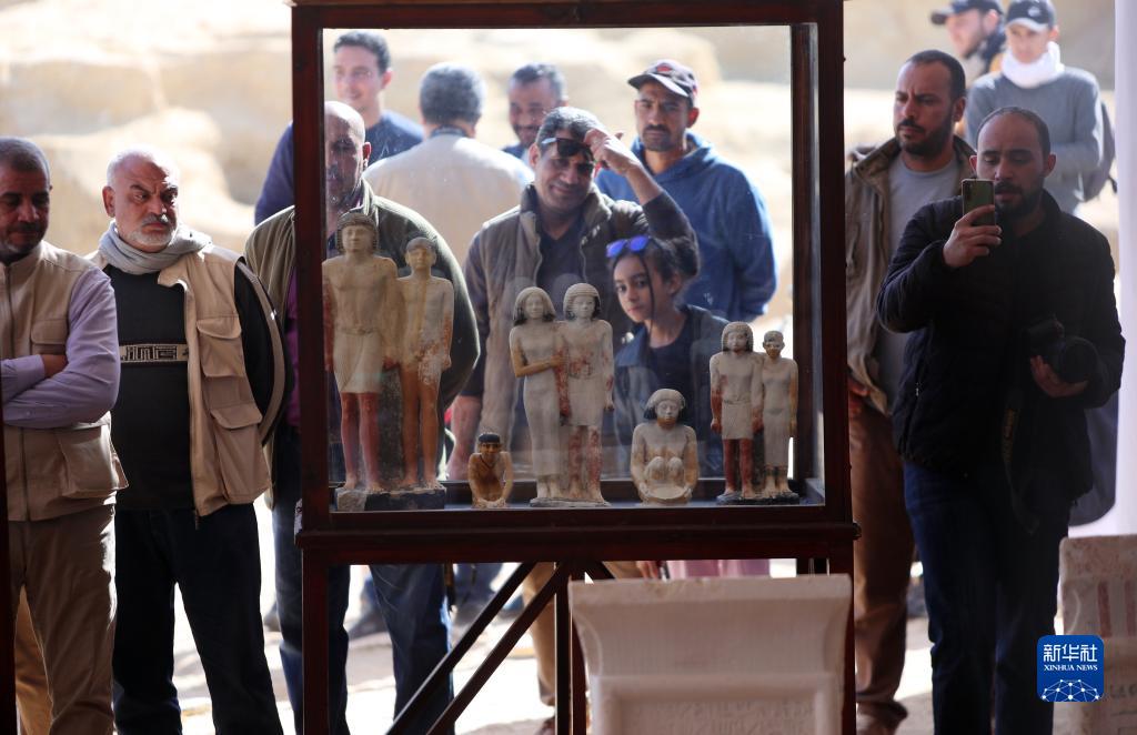 1月26日,在埃及塞加拉地區考古發掘現場,人們聚集在出土的文物旁。
