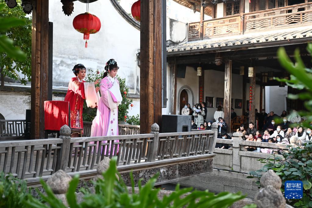 1月27日,游客在福州三坊七巷水榭戲臺觀看越劇。