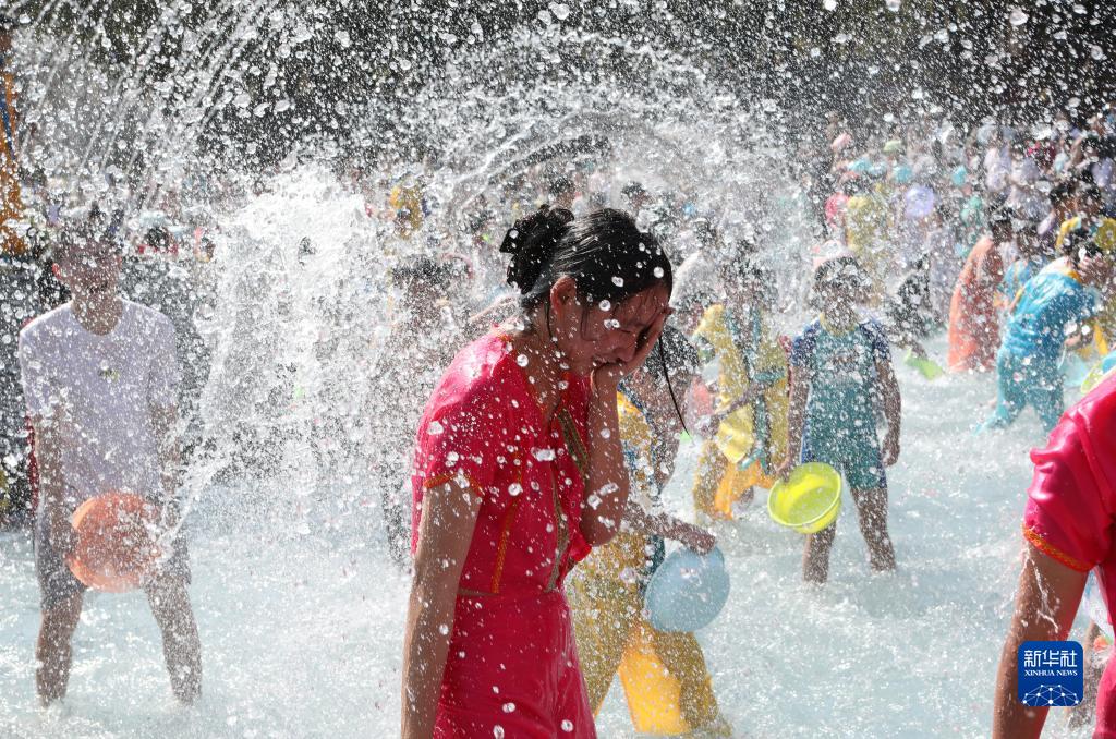 1月25日,游客在西雙版納傣族園景區參加“天天潑水節”活動。