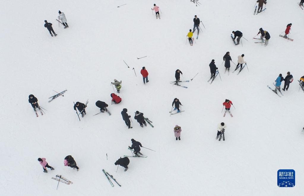 1月26日,游客在江蘇淮安一滑雪場滑雪(無人機照片)。