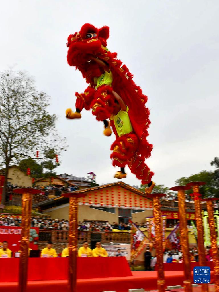 當日,2023年肇慶市端州區迎春醒獅爭霸賽在肇慶市石牌里文創街區廣場鳴鑼開賽,共有10支傳統南獅隊伍、5支高樁醒獅隊伍參賽展“絕活”,精彩的比賽讓現場觀眾大飽眼福。新華社發(劉春林攝)