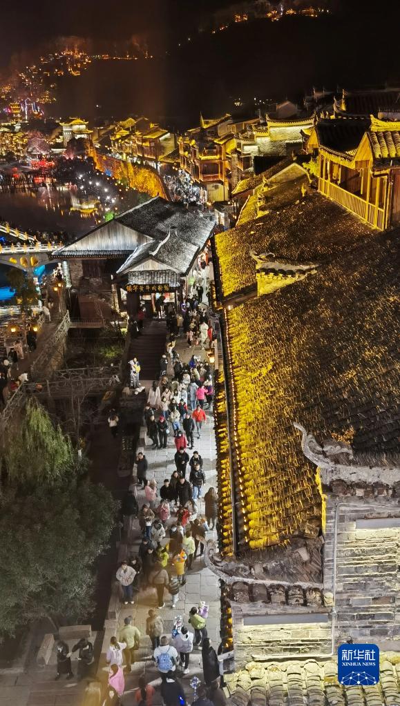 1月24日,人們在鳳凰古城夜游。