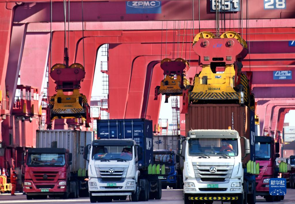 1月27日,在青島港前灣集裝箱碼頭,貨車在運送集裝箱。