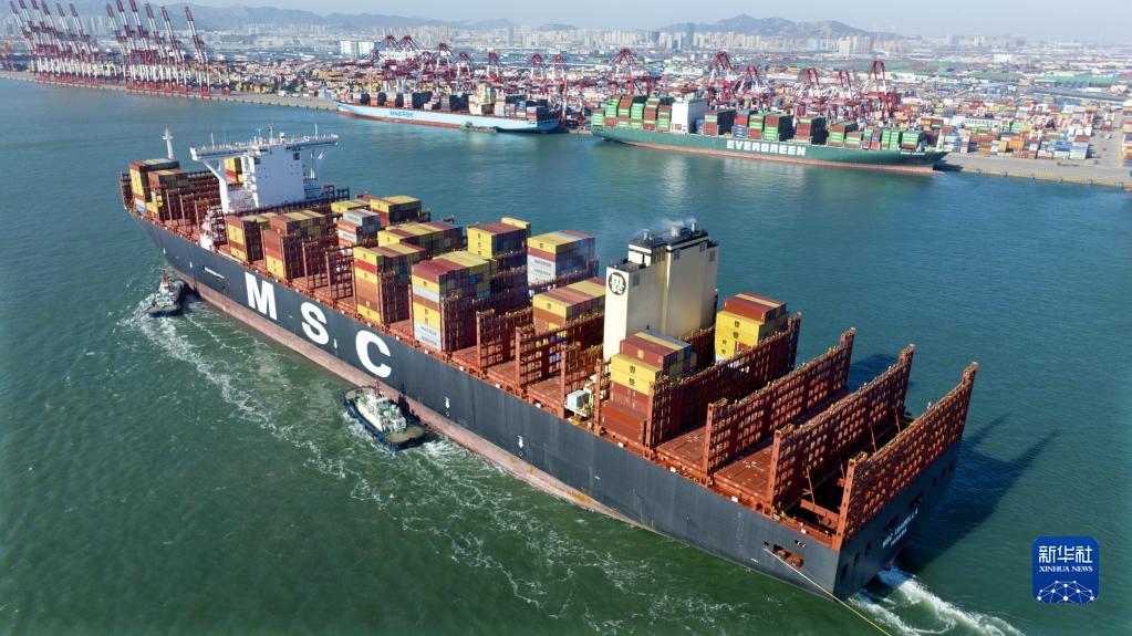 1月27日,一艘集裝箱貨輪緩緩駛入青島港前灣集裝箱碼頭(無人機照片)。