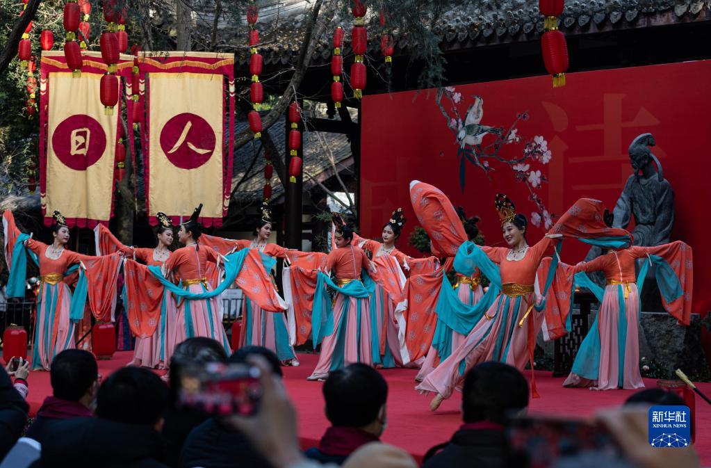 1月28日,在四川成都舉行的“人日”游草堂、祭拜詩圣杜甫活動現場,演員在表演舞蹈。