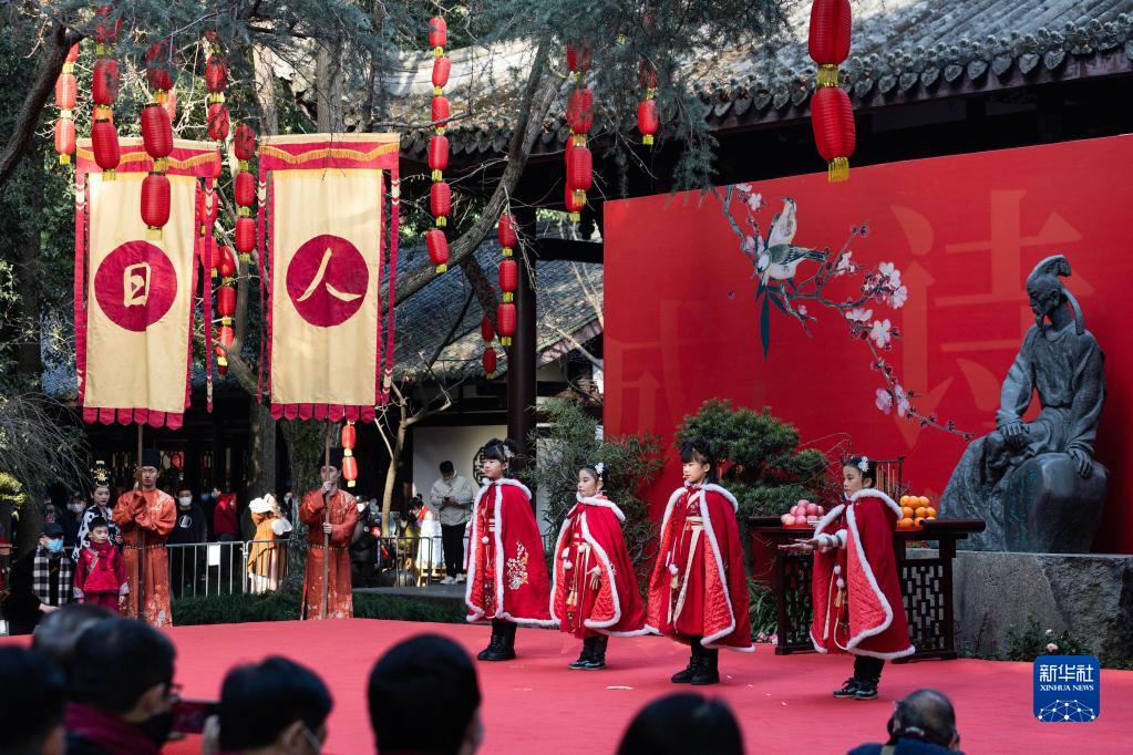 1月28日,在四川成都舉行的“人日”游草堂、祭拜詩圣杜甫活動現場,草堂小學的學生代表誦讀杜甫詩。