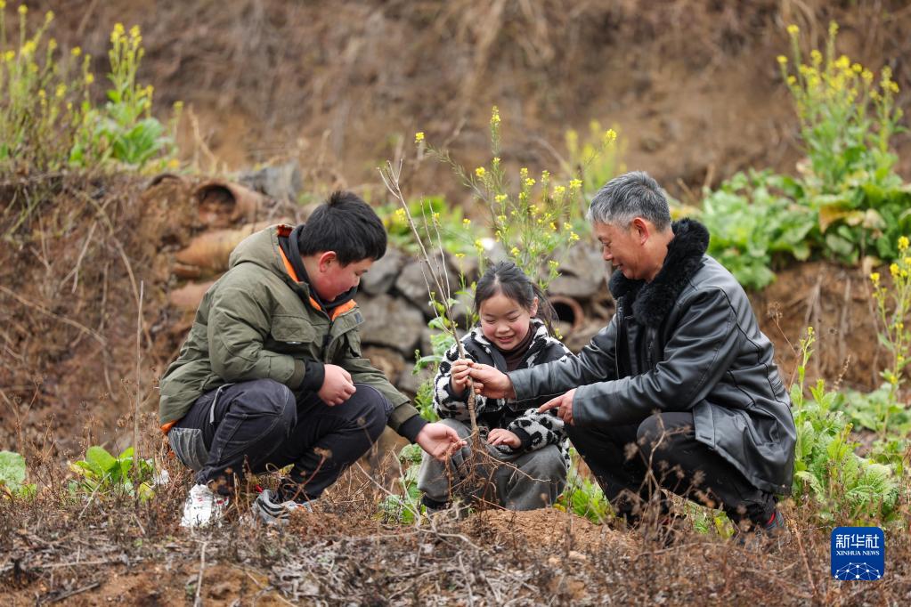 1月28日,在貴州省畢節市赫章縣平山鎮對江社區,家長給孩子講授植樹知識。
