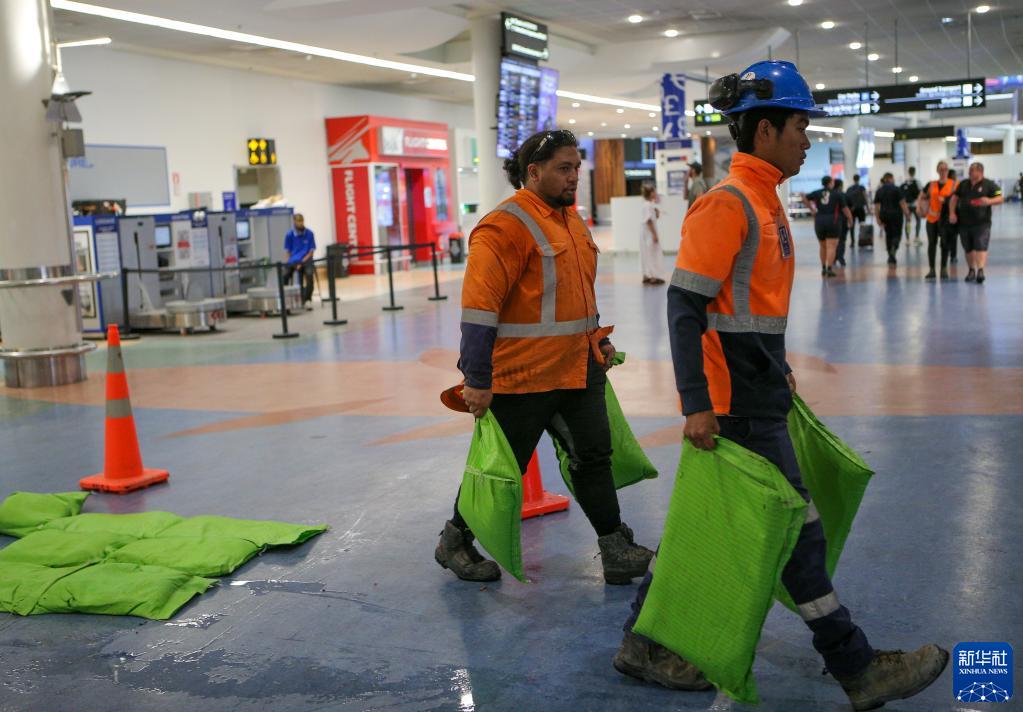 1月28日,工作人員在新西蘭奧克蘭國際機場清理候機大廳積水。