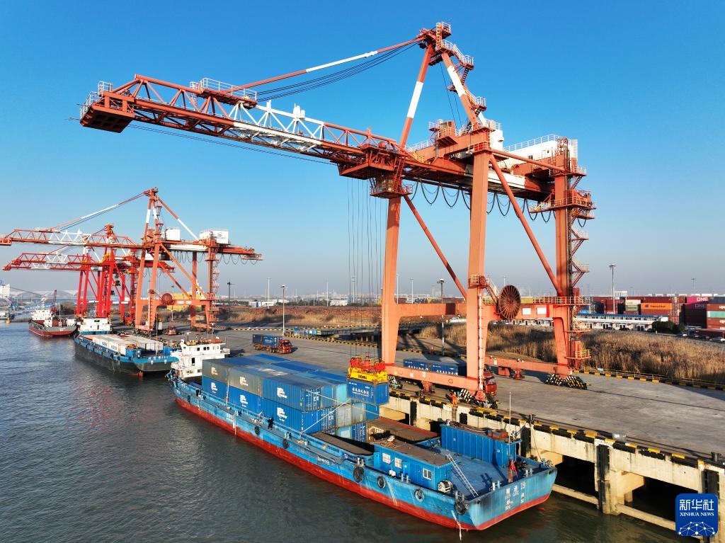 1月28日,貨輪在江蘇省揚州港集裝箱碼頭進行集裝箱裝卸作業(無人機照片)。