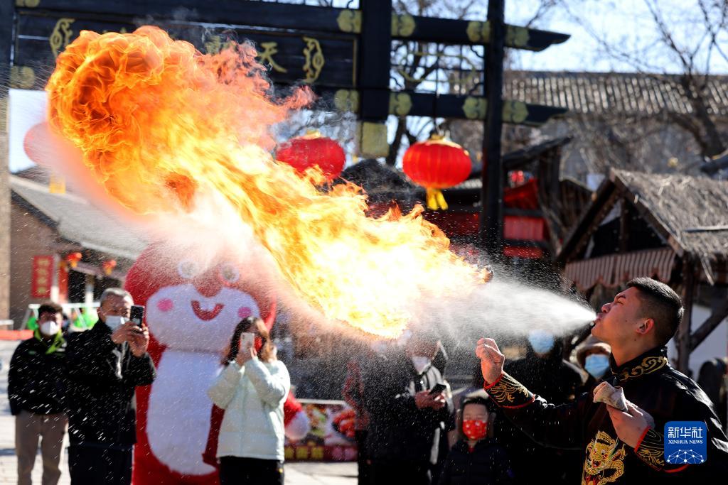 1月24日,民間藝人在山東省棗莊市鐵道游擊隊景區表演“噴火”絕活。