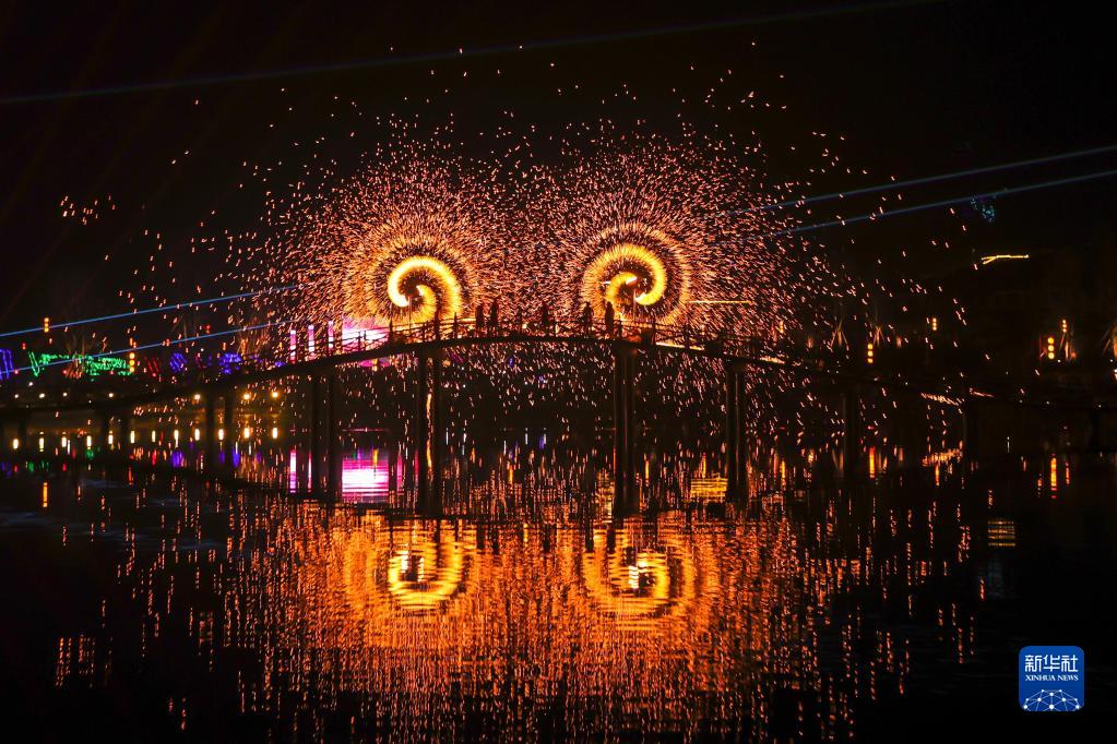 1月26日,民間藝人在四川省遂寧市大英縣宋井桃源景區表演“打鐵花”。