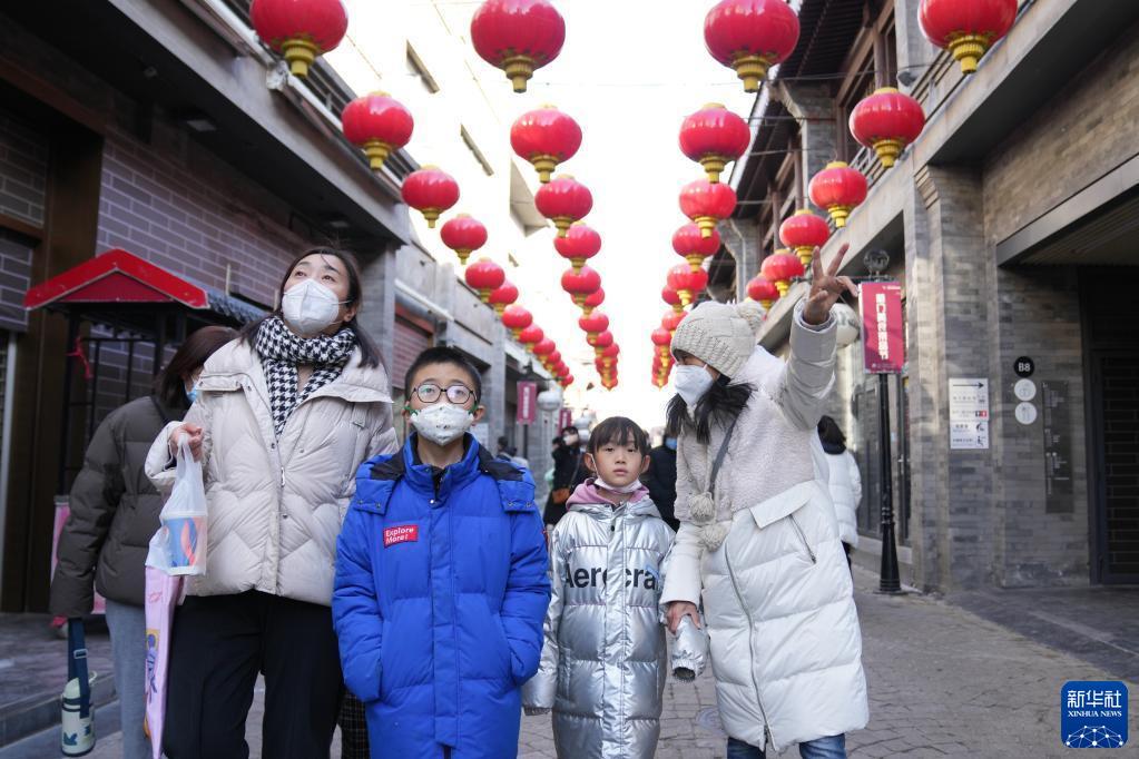 1月28日,在北京市東城區鮮魚口街,導游何靜(右一)在為游客講解。