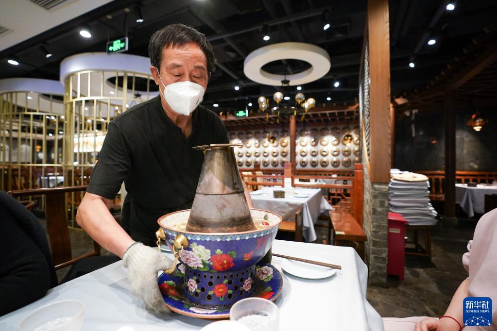 1月28日,在北京東來順飯莊總店,服務員劉玉成在為第一桌客人上火鍋。