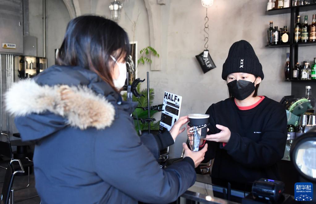 1月28日,在北京市東城區隆福文創園的一家咖啡店,主理人璐琪(右)將制作好的兔年開工第一杯咖啡交給顧客。