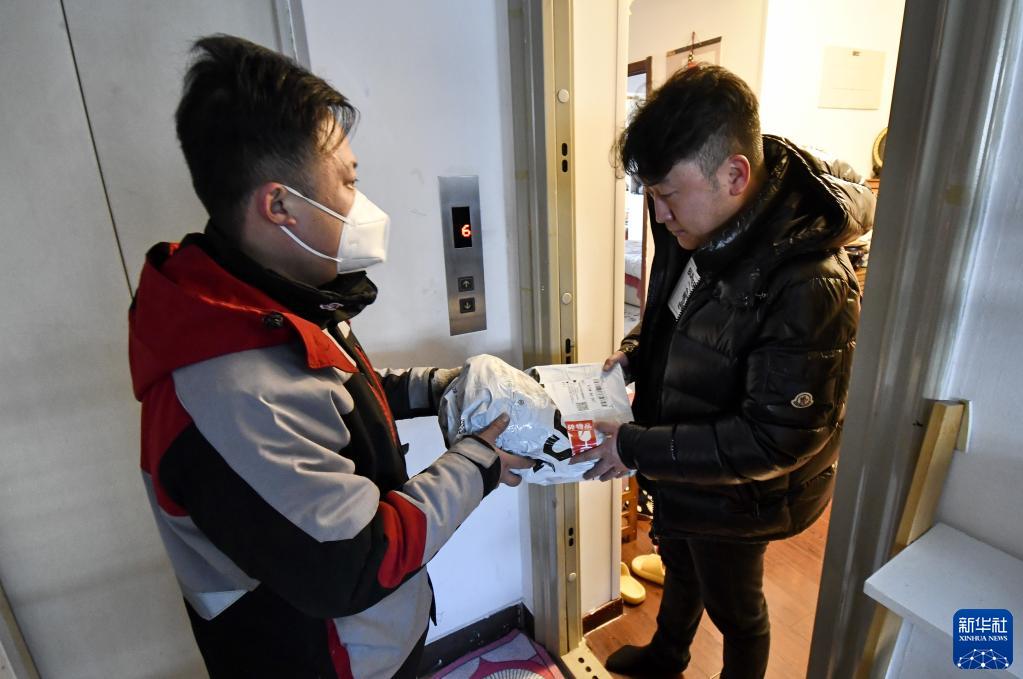 1月28日,順豐速運快遞員蔣雙建在北京市朝陽區青年路某社區送兔年開工第一個工作日的第一單快遞。