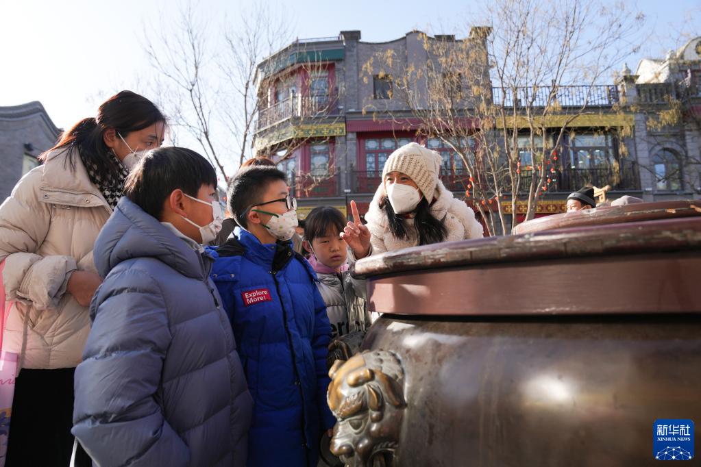 1月28日,在北京市前門大街,導游何靜(右一)在為游客講解。