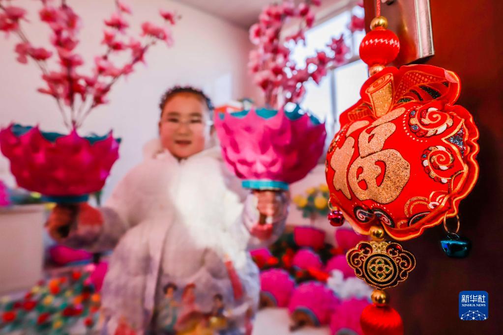 1月28日,遷西縣灑河橋鎮的一名小朋友在展示元宵節演出的跑花燈。