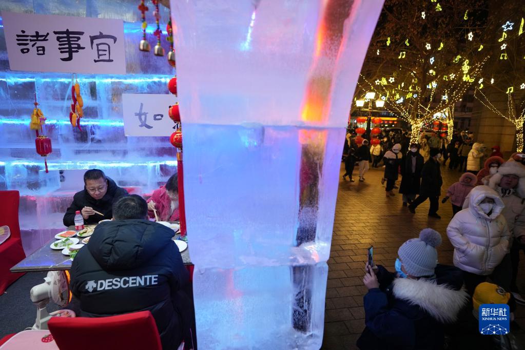 1月28日,游客在哈爾濱中央大街的“冰屋”內品嘗“冰屋火鍋”。