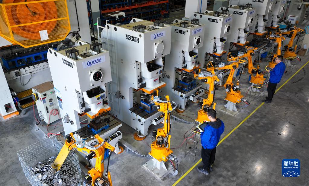 1月29日,在浙江省湖州市德清縣鐘管鎮的浙江南泵流體機械有限公司生產車間內,工人在監測自動沖壓線機械手工作情況,趕制水泵零配件(無人機照片)。