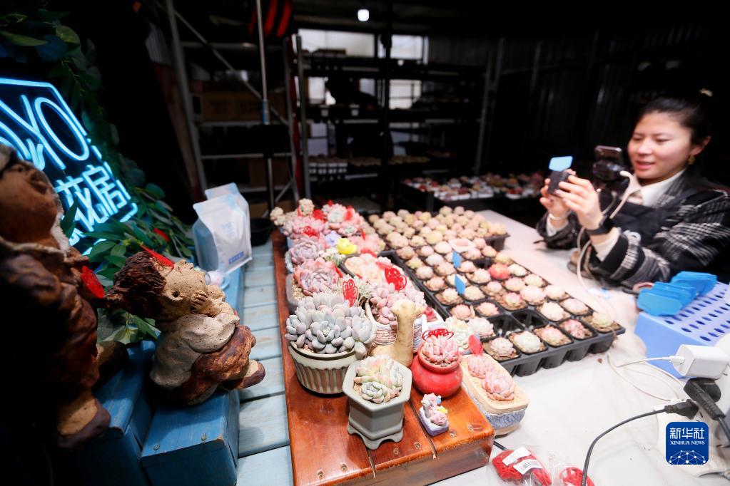 1月29日,在青島市即墨區慢悠花房多肉植物種植基地,一名網絡主播線上銷售多肉植物。