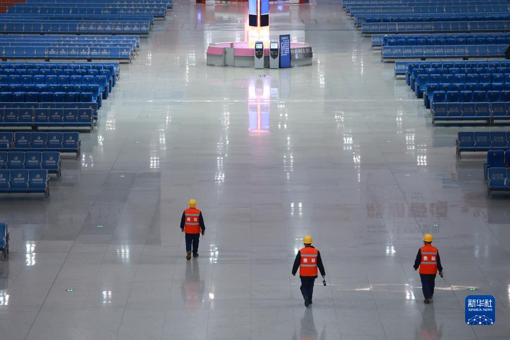 1月29日,工作人員走在空無一人的貴陽北站候車大廳內。