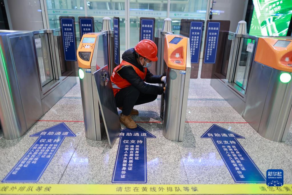1月29日,設備檢修人員在貴陽北站檢修進站閘機。