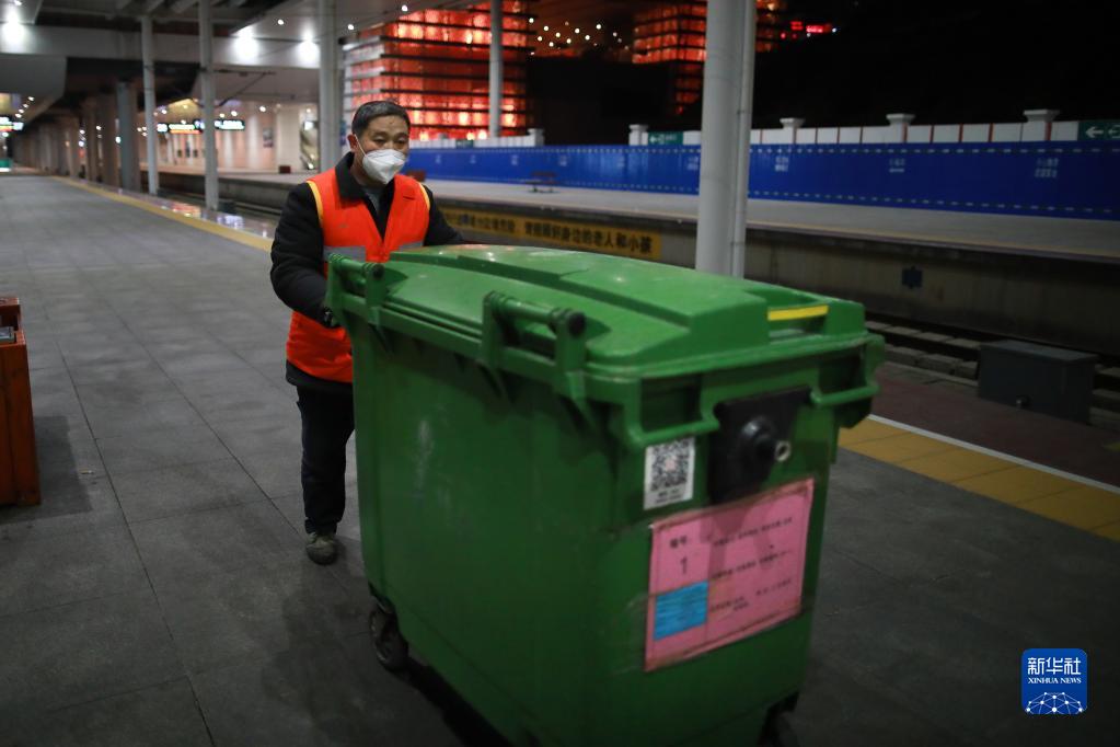 1月29日,一名保潔員在貴陽北站站臺清運垃圾。