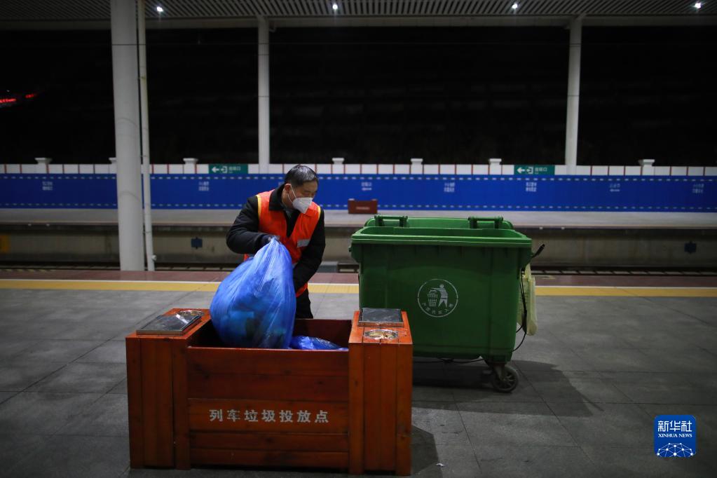 1月29日,一名保潔員在貴陽北站站臺清運垃圾。